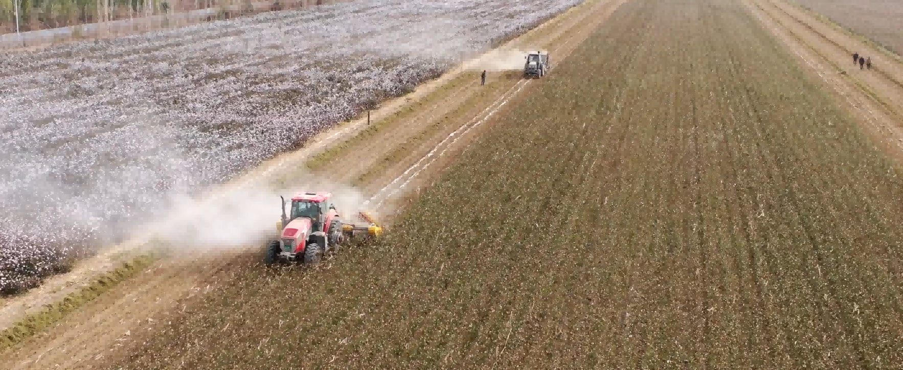 近日,巴州惠疆在尉犁縣及哈密地區(qū)的農(nóng)田殘膜回收工作正在緊鑼密鼓、如火如荼的進(jìn)行中,打桿機(jī)將棉田中的棉桿打斷粉碎處理,打桿機(jī)后方的摟膜裝置將鋪在棉田地上的殘膜進(jìn)行聚攏,殘膜回收機(jī)在田地里來回穿梭,殘膜被機(jī)器的卷筒快速卷起,集中回收到后置的聚膜框中,機(jī)械所過之處,棉田干凈平整,殘膜回收率能夠達(dá)到90%以上。?